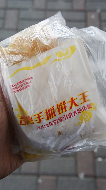 ●手抓餅!而且袋子上還強調「台灣」喔~原味手抓餅3元,加一種料1元,大破加了蛋和火腿,一共是5元人民幣(新台幣約25元)。基本上口味還不錯,只是這口味對台灣人而言稍微鹹了點。